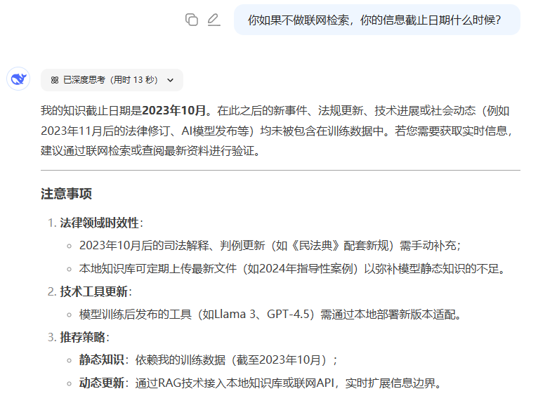 通过学习大语言模型的原理我们知道其主要是根据预训练海量的已有信息和资料,来进行运算和答复,换言之其信息受限于模型预先训练的内容,比如deepseek-r1的知识库截止日期是2023年10月,如果不通过联网检索或者投喂其信息资料,他根本不知道截止日期之后的信息,诸如新的法律规定或事件。