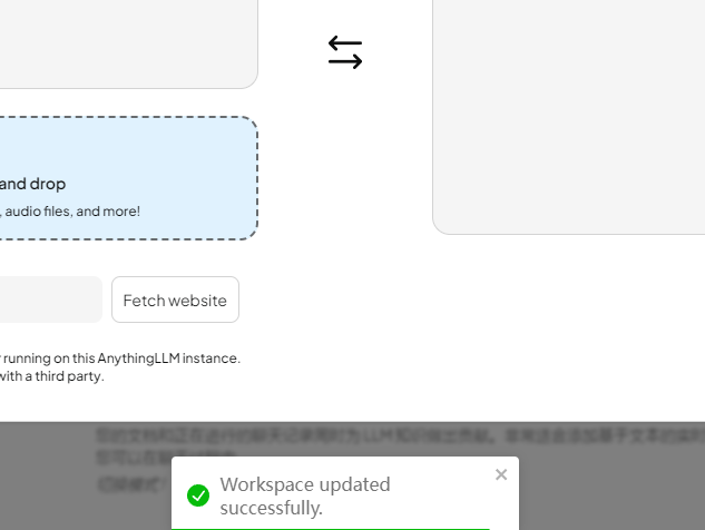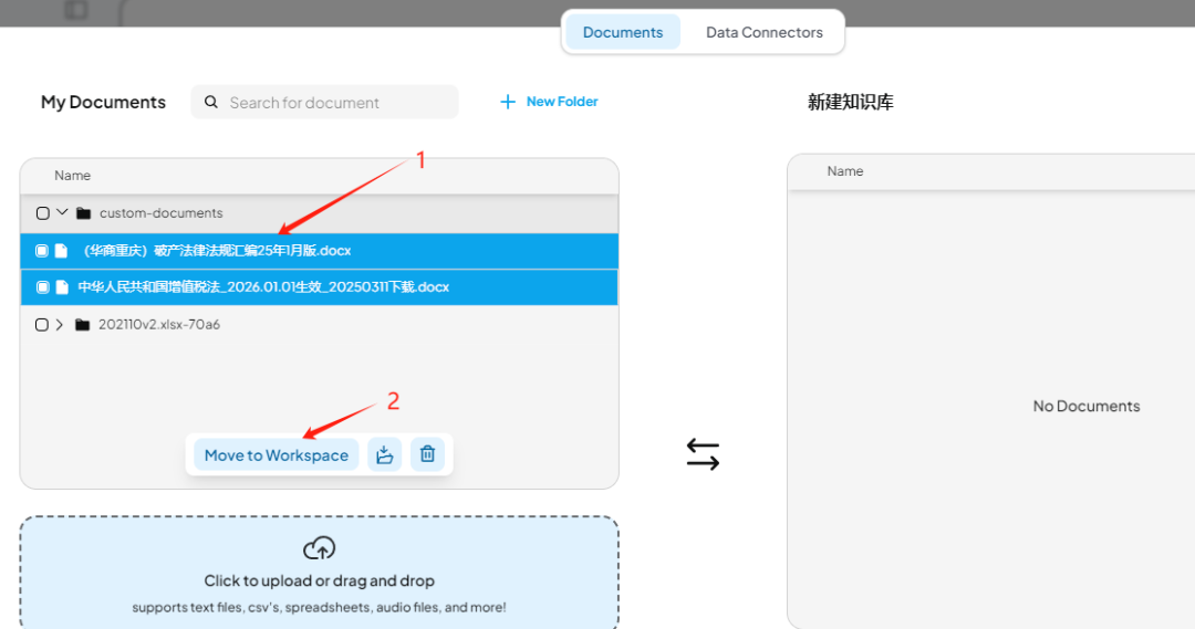 选择上传图标,然后可以通过拖拽或路径选择等方式上传知识库文件。然后点击Move to Workspace,移动到右侧后,保存并使用嵌入模型进行解析。等待解析完毕后,屏幕下方会显示成功消息,知识已经录入知识库。然后就可以回到对话界面进行对话检测了。