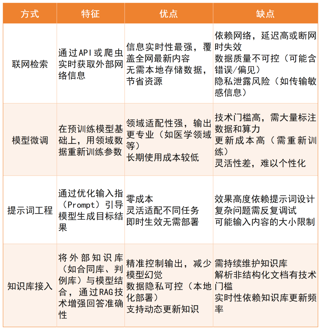 **结合前述原理和时效局限性的问题,所以给模型提供最新的资讯显得尤为重要,给模型提供资讯主要有四种方式,分别是联网检索、模型微调、提示词工程、知识库接入,**我用表格罗列一下其特征和优缺点对比。