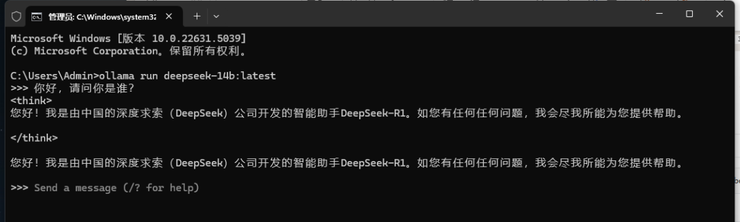 如我们选择32b模型,那显存最好高于32b所对应的20GB,否则运行速度较慢,选择后复制对应下载命令,直接将对应命令输入命令提示符进行下载。下载完成后直接可以在命令提示符窗口进行对话。