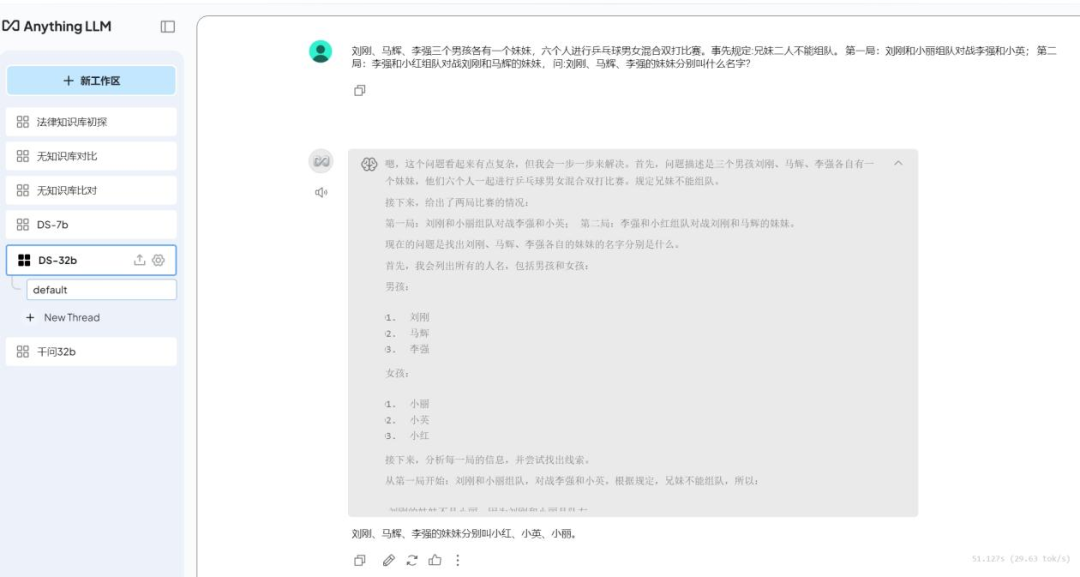 关于模型选择,我尝试对比了7b模型和32b模型,同样的逻辑题7b模型给出的答案就出现了错误**(但32b花了50秒解答,7b模型4秒就给出了答案,抛开对错不谈你就说快不快吧)**,我详细看了推理过程,发现模型可能忽略了同一个人不可能同时出现在对战的两个队伍中的自然规则,所以我在提示词中加入这个条件后,7b模型就给出了正确答案。