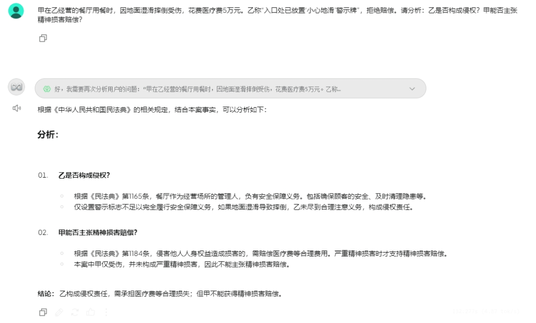虽然最早ChatGPT等产品出圈已经艳惊四座,但之前我更多的把Ai看作一个能够汇总搜索结论并具备一定写作能力的“超级搜索引擎”,但这次的学习和实践,我深切的感受到了其已经具备推理能力。我分别尝试问了模型一道小学奥数逻辑题和一个案例分析题,模型不仅给出了正确的答案,还向我展示了其推理过程。**这证明Ai技术不仅可以适用于法律检索、案例检索等场景,甚至可以进行案件推理和庭审推演,甚至是嵌入到业务的工作流程中形成自动化。**同时,通过本地知识库的搭建和更多数据的本地投喂,以及衔接通过本地部署衔接其他应用,Ai技术更进一步的融入律师的工作场景,作为“超级助手”极大的提工作效率。