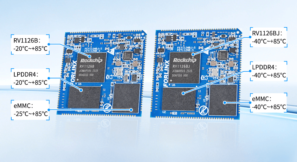 飞凌嵌入式FET1126BJ-S核心板(工业级)支持-40℃~+85℃环境温度下工作,具备出色的可靠性和环境适应能力;同时,FET1126B-S核心板(宽温级)相较同类产品更具优势,商业级配置即可满足-20℃~+85℃工作环境需求。它搭载高带宽LPDDR4内存,相较于DDR4商业级0℃~+70℃的温宽限制,LPDDR4商业级芯片即可覆盖-20℃~+85℃,实现低成本与宽温性能的兼顾。