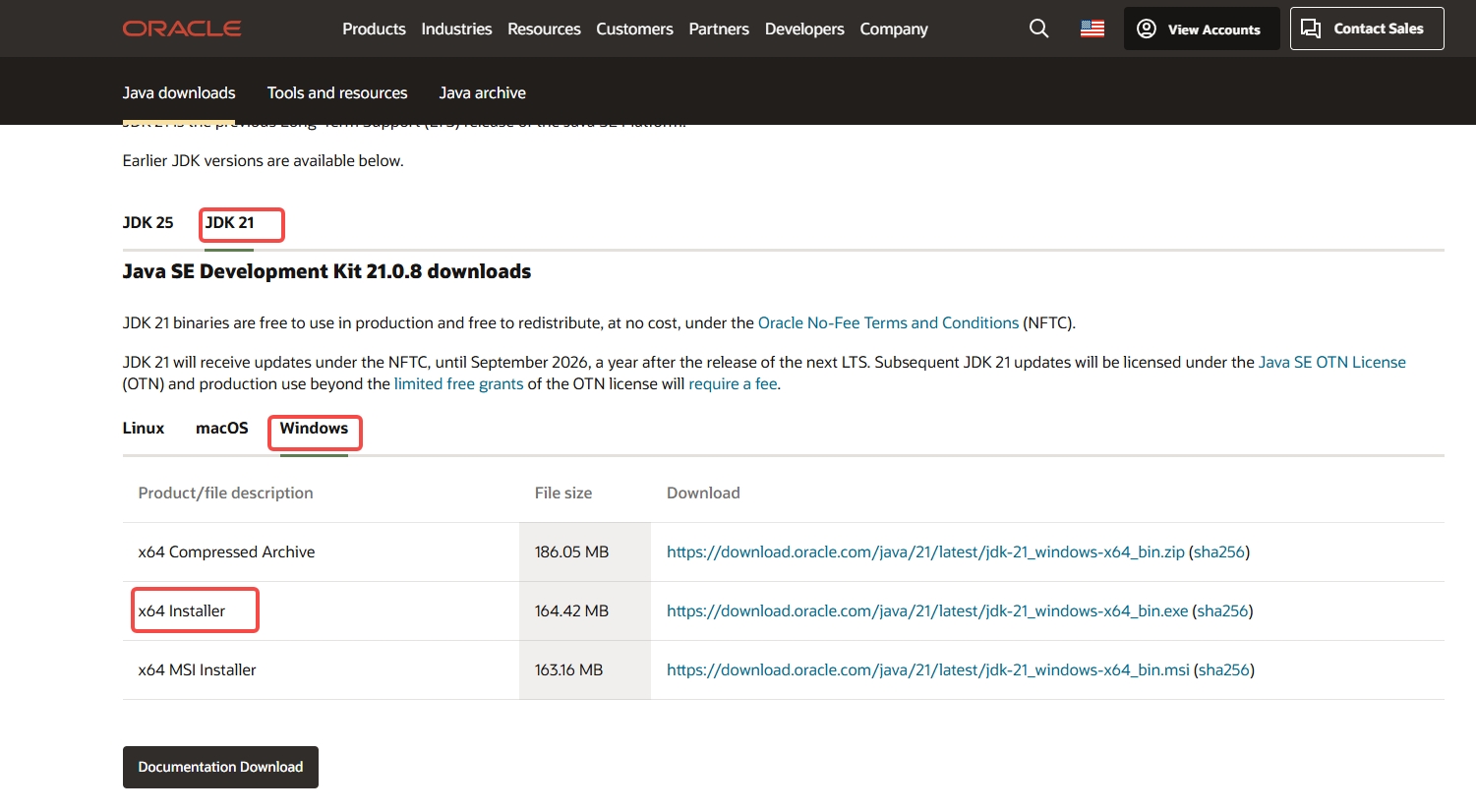 之前Windows构建节点中配置的本地Windows目录为:E:\Nodes,在这个目录下安装代理程序,本地Windows下需要安装java环境,java版本需要保持与ubuntu中安装的java版本一致,我这里为JDK21,去Oracal官网选择对应的版本下载,地址:Java Downloads | Oracle