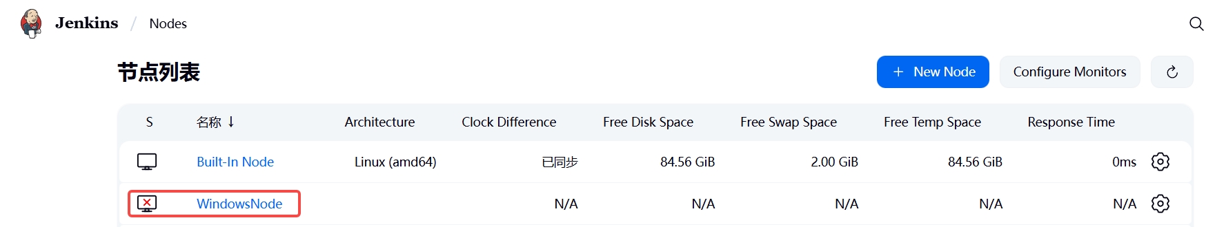 设置完成后点保存,得到节点WindowsNode,此时处于未连接状态,如下图所示