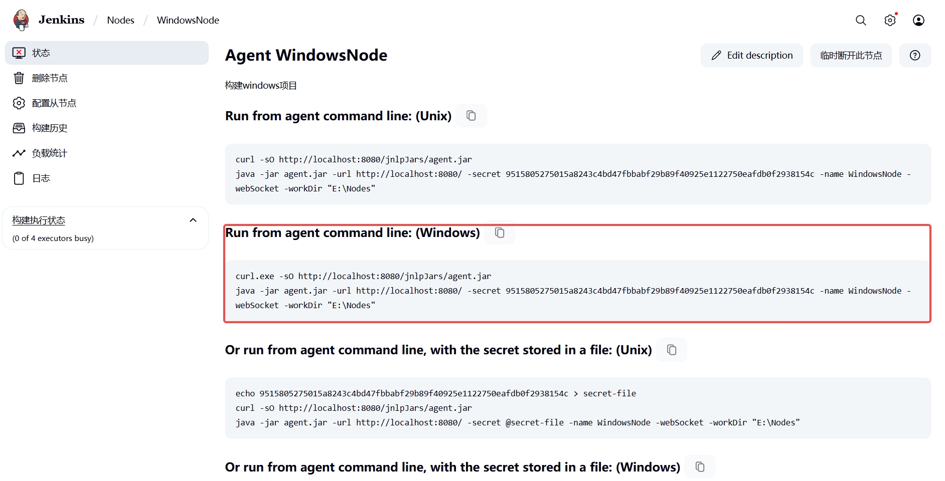 java -jar agent.jar -url http://localhost:8080/ -secret 9515805275015a8243c4bd47fbbabf29b89f40925e1122750eafdb0f2938154c -name WindowsNode -webSocket -workDir "E:\Nodes"