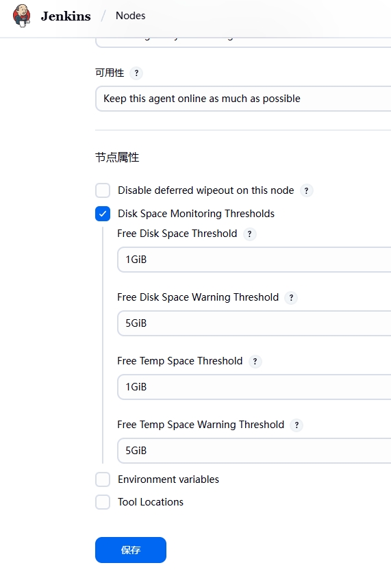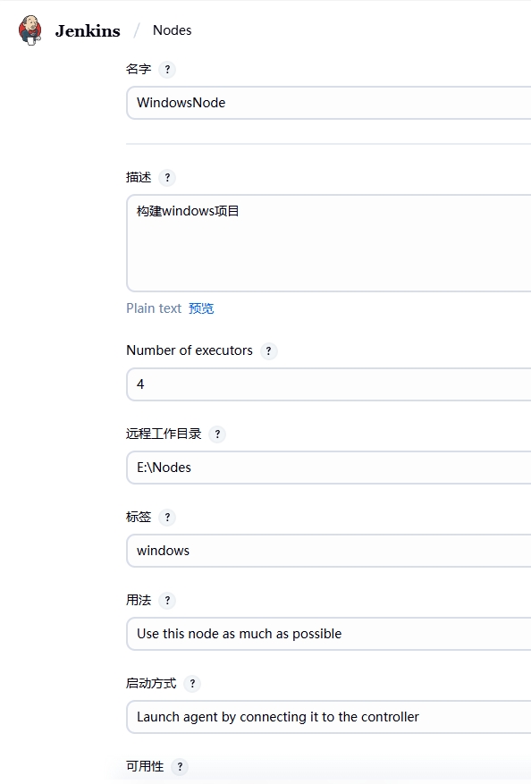 其中 Number of executors 表示Jenkins 可以在此节点上执行并发构建的最大数目
