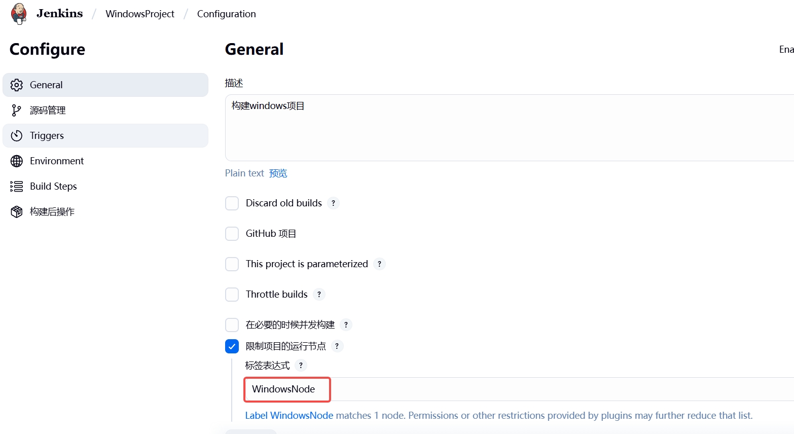 在Jenkins上创建一个Item,选择 限制项目的运行节点,标签表达式填之前创建好的节点名称 WindowsNode