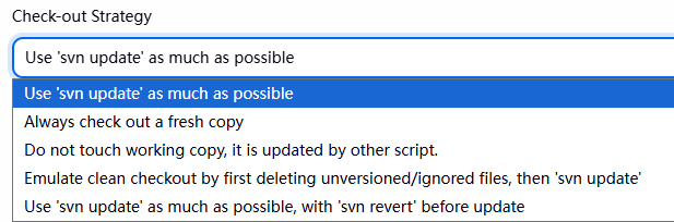 Emulate clean checkout + svn update:简称模拟干净检出 + 增量更新,逻辑是先删未版本化 / 忽略文件,再执行 svn update,冲突规避是几乎杜绝(仅极端同行修改冲突),优势是增量拉取速度快、兼顾干净与效率,劣势是极端情况需手动解冲突,场景是追求更新效率、需保留受控文件、团队协作。