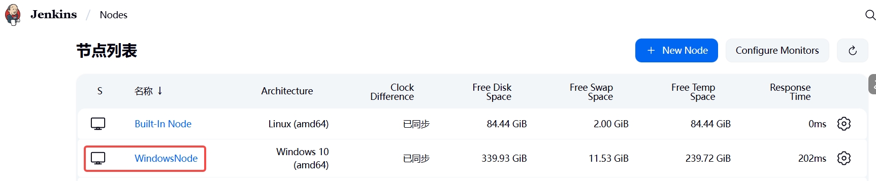 写入一个.bat文件 runnode.bat,双击启动。连接之后Jenkins/Nodes上的WindowsNode节点连接状态发生改变,如下图,表示该节点与Jenkins服务器已经建立连接。