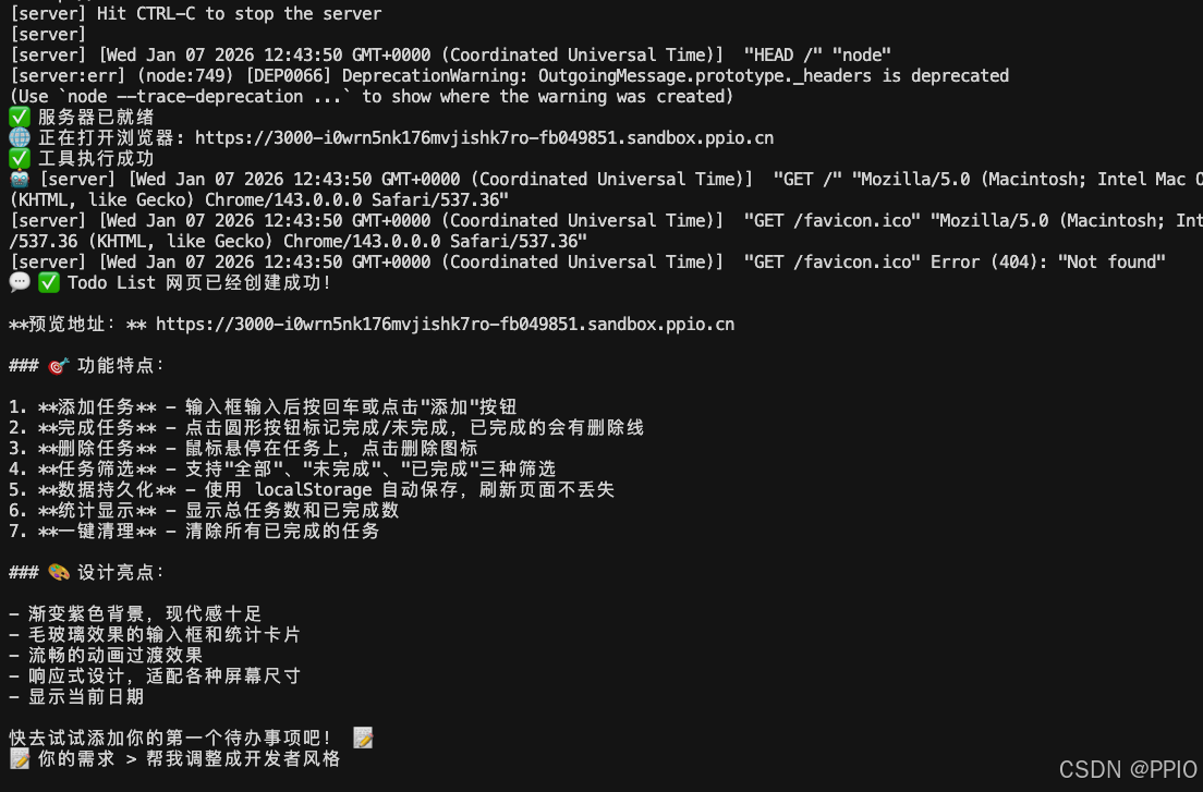 PPIO Agent 沙箱 与 Claude SDK 的集成为 AI Agent 开发提供了一种更高效、更自动化的工作流。它通过提供一个即时、隔离且可编程的执行环境,解决了传统 AI 编程中反馈链路过长和环境配置困难的核心问题。我们相信,这种让 AI Agent 能够直接与真实环境交互的模式,将是未来 AI 辅助软件开发的重要方向。