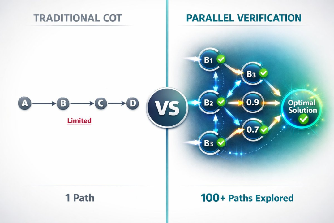 专家型思考者并不会沿着一条冗长的推理链一路走到底,而是同时运行多个验证循环。