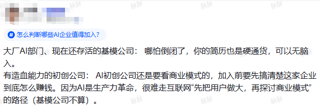 由于目前AI太火了,不仅大厂成立了AI部门,市场上还新生了许多AI初创公司,机会多了也有纠结,怕去风口上的公司只是烧钱讲故事,又怕去技术强的却完全找不到落地场景。那么,如何判断哪些AI企业值得加入呢?
