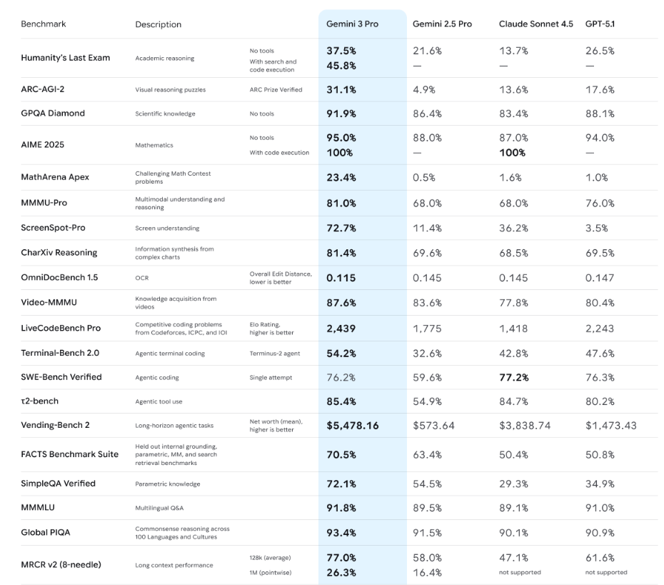 而且在多项权威基准测试中,Gemini 3 Pro 不仅干掉了自家前代,也把不少竞争对手甩在身后。
