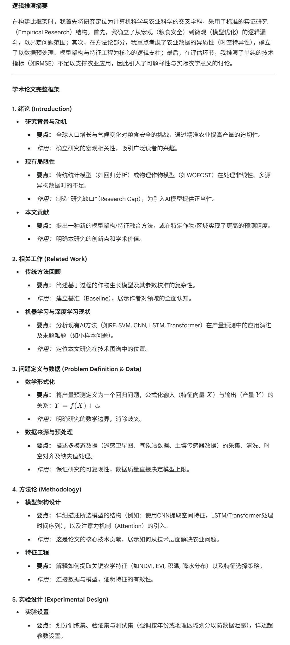 我以“AI模型在农业产量预测中的应用”这个研究主题,让Gemini 3pro搭建论文框架。效果如下:
