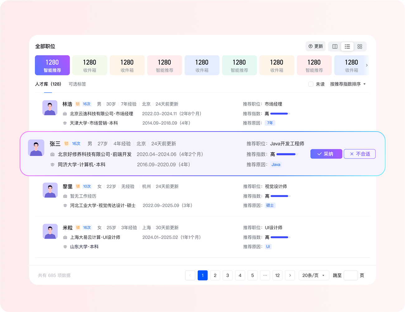 - 人才库智能运营:深度挖掘企业存量人才资源,通过智能推荐算法匹配高潜力候选人,减少对外招聘依赖。