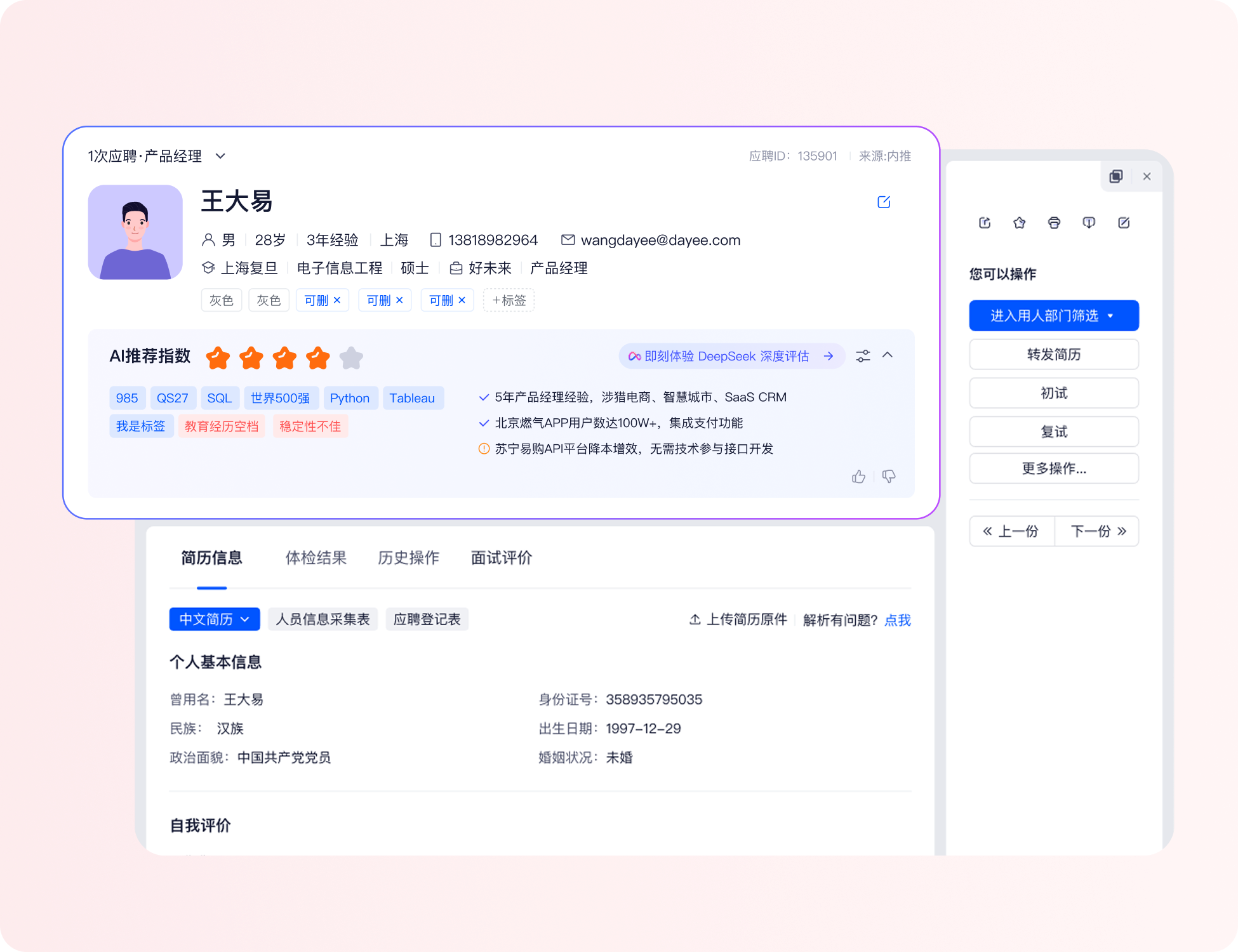 - 简历处理环节:可快速解析 PDF、Word、图片等多种格式的简历,自动提取候选人关键信息(如 “上海复旦大学硕士”“3 年产品经理经验”“Python 技能”),并生成人岗匹配度评分与标签,精准提炼人才优劣势;