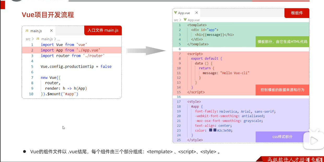需要说明的是这种.vue文件是在vue中称他们为组件,然后app.vue是根组件,我们以后基本不会在根组件引用写