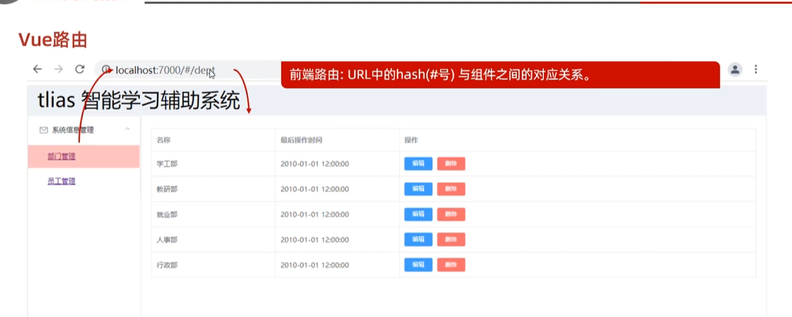 官方解释是路由是指url中的hash(图片中有问题,其实是指#之后的部分比如dept就是一个hash)与组件(.vue结尾的文件就叫组件)的对应关系。
