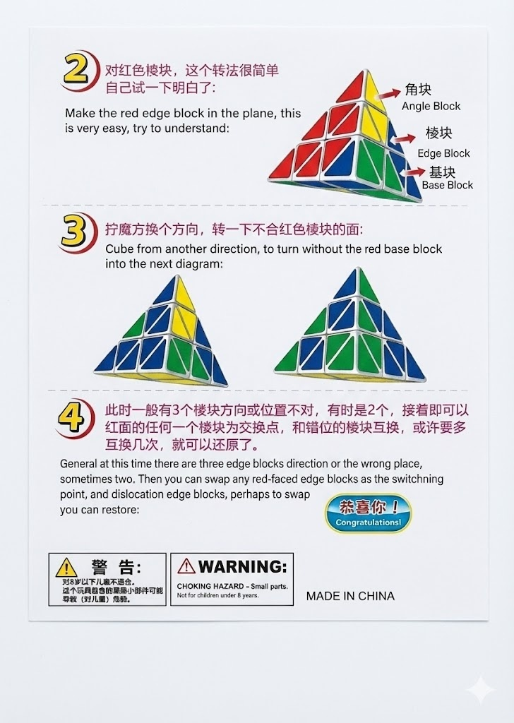 【现象描述】 用户上传了一张金字塔魔方实物图,要求 AI 将其替换到说明书的线条图中。AI 生成的结果往往是:魔方的朝向(Facing)虽然大体正确,但具体的层级透视完全错误。