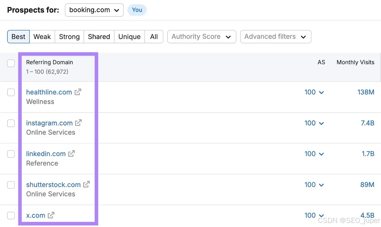Backlink Gap 中显示的域名更有可能链接到你的网站,因为它们已经链接到类似的网站(你的竞争对手)。