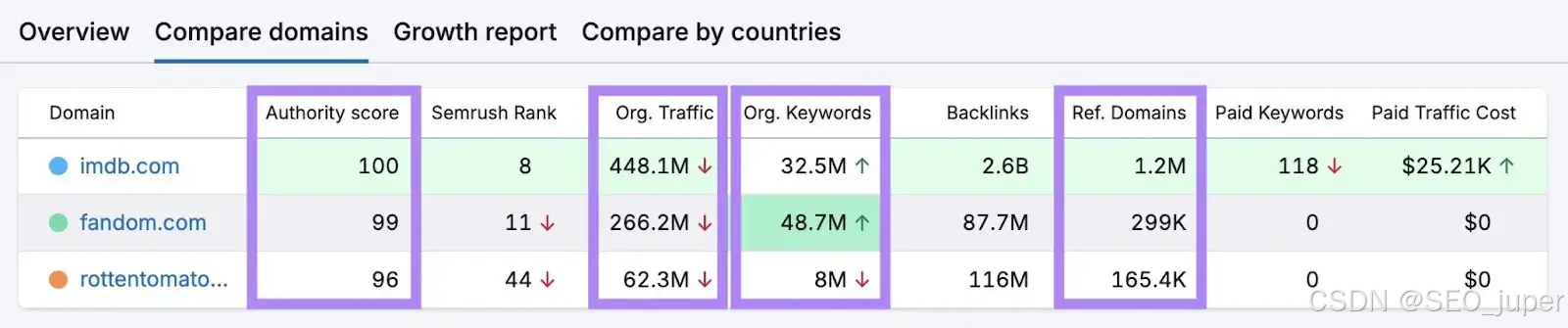 域名概览将为你提供所选域名关键指标的扎实比较。这些课程能让你清楚自己落后或表现突出的地方。