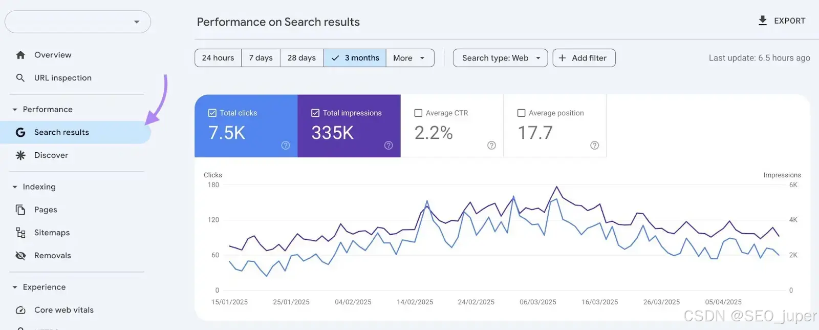 查看侧边栏的谷歌搜索控制台“搜索结果”报告,查看你的总点击量和流量趋势。注意任何急落或尖峰。