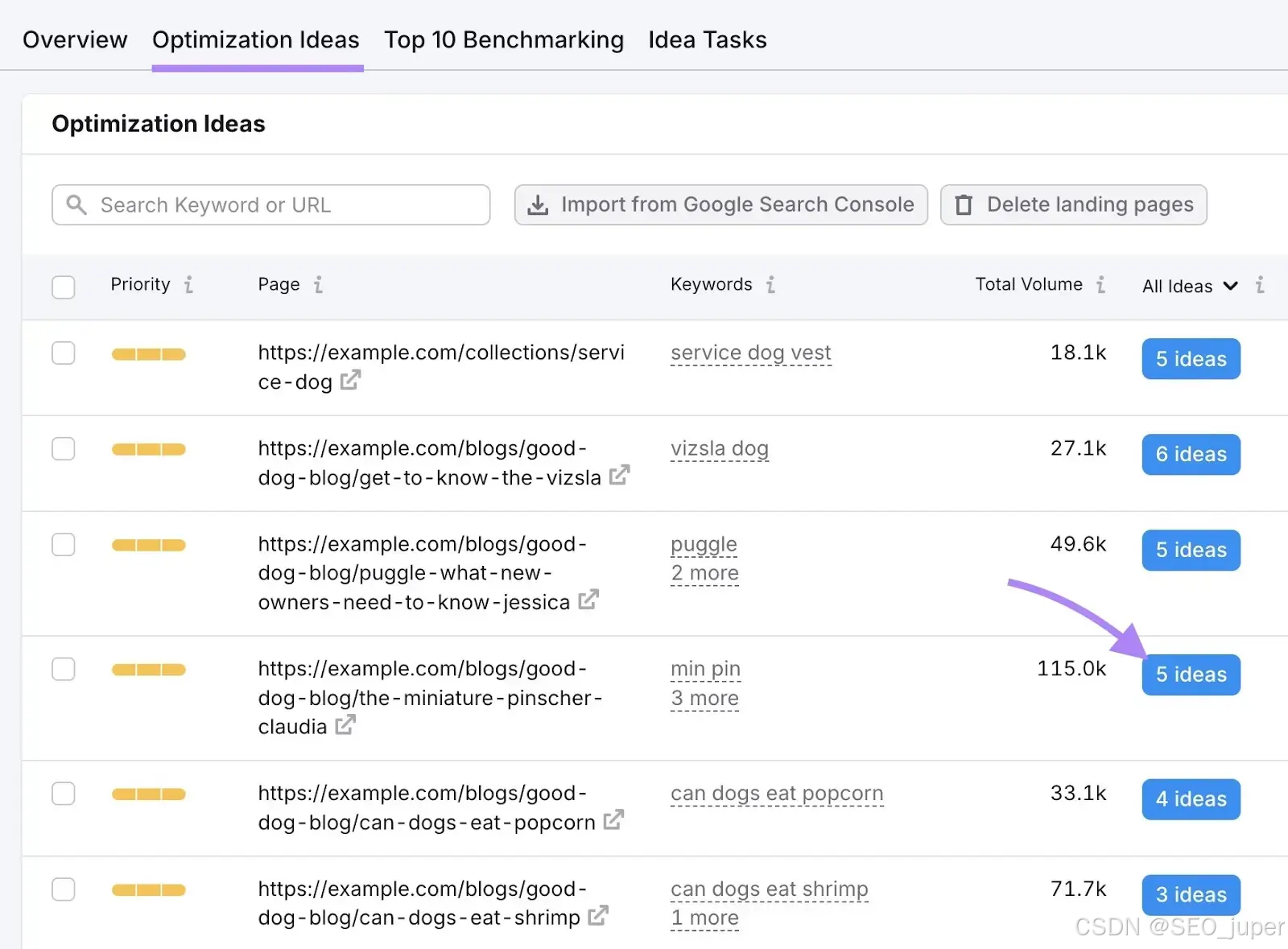 首先,为你的网站设置一个项目。让页面SEO检查器分析你的网站。完成后,你会看到一个页面列表,每个页面都有推荐。