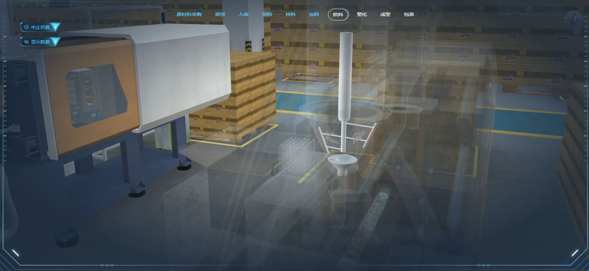 - 生产流程仿真:对厂区所有设备、工艺流转关系、环境进行建模动画还原,实现基于数据驱动的场景动画仿真模拟