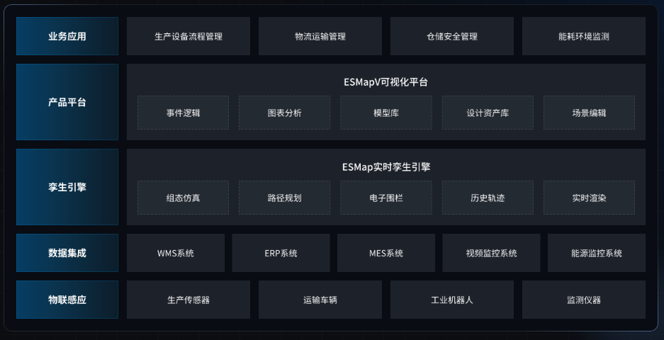 - 产品平台层:以ESMapV可视化平台为核心,提供事件逻辑处理、图表分析、模型库管理、设计资产库和场景编辑等能力,为上层应用提供可视化技术支撑。
