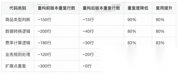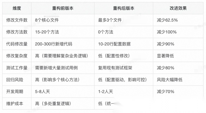 - 质量改善:代码量减少52%,重复代码消除100%,改动点从8个文件减少到1-2个;