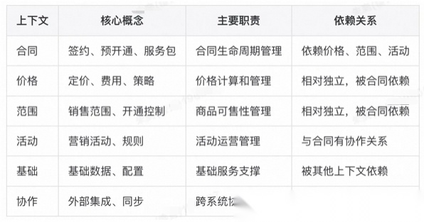 从上一步可以看出,AI拆解的限界上下文是基于package结构进行拆分,未能深入分析业务语义,这是AI的薄弱环节,需要人工介入修正。经过人工分析后的限界上下文如下: