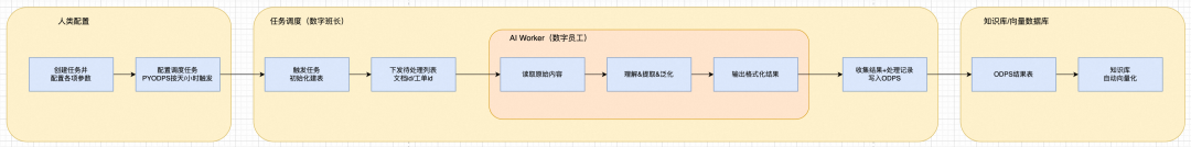 在本文中,我们更多是让 AI 扮演“知识整理员”——负责自动读文档、提取知识、泛化问法、写入知识库。这其实只是一个单步骤岗位。