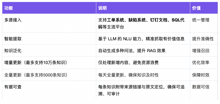 - 多源接入:支持钉钉文档、工单、缺陷、SQL代码等主流平台;