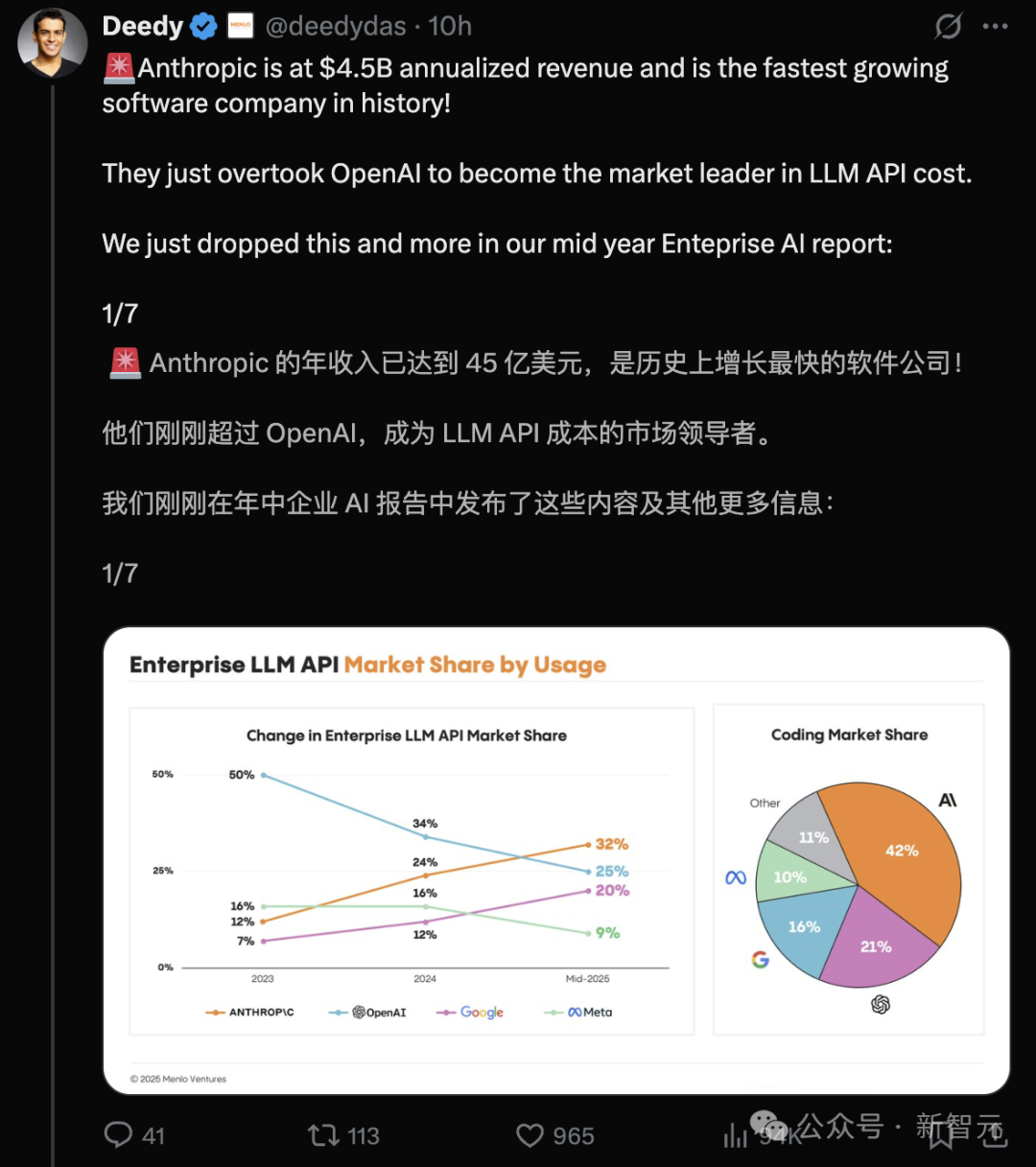 GPT-5再不来,奥特曼正要熬夜头秃,无法入眠了!刚刚,OpenAI最强劲敌Anthropic被曝年化收益已达45亿美元,晋级为史上增长最快的软件公司。在LLM API赛道上,Anthropic成功登顶,而OpenAI在AI编程上更是落荒而逃,市场份额只有Anthropic一半!X上的网红投资人、硅谷VC大佬Deedy,继2024年AI产业报告之后,重磅推出了年中LLM市场更新报告:这次他直接断言