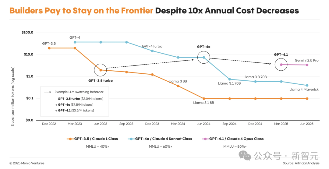 即使模型的价格每年下降10倍,开发者也不会为了节省成本,只用旧模型;他们只会集体迁移到性能最强的新模型。
