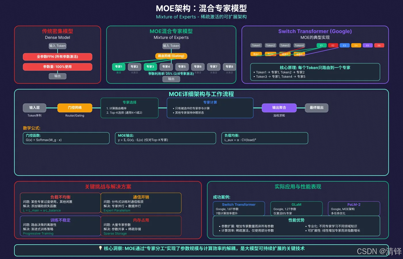 专家⽹络是指MoE模型中的多个⼦⽹络(即“专家”)。每个专家通常是功能相同结构类似的神经⽹络模 块(例如Transformer中前馈⽹络部分),但在训练过程中可各⾃学习不同的专⻓。在经典MoE中,这些 专家共同构成模型的⼀层或若⼲层,仅有⼀部分专家会针对每个输⼊样本被激活。通过这种⽅式,模型 参数规模可以⾮常庞⼤,但每次推理或训练仅计算⼀⼩部分参数,从⽽保持计算成本近似恒定。这种架 构提⾼了模型容量(参数数⽬巨⼤带来的表示能⼒)与计算效率的折中:例如Switch Transformer模型 具有⾼达1.6万亿参数,但其训练计算量与⼀个100亿参数的稠密模型相当。