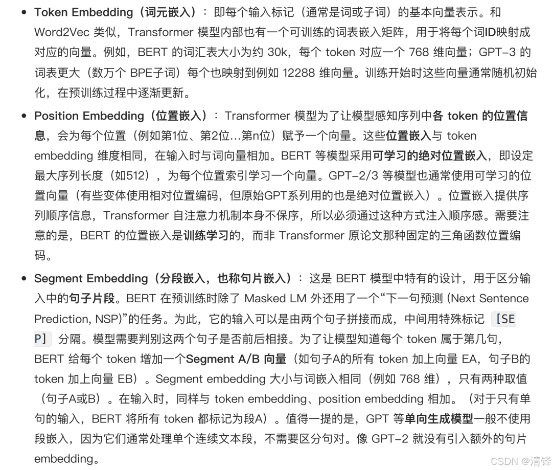 在transformer的输入层有词嵌入模块。主要包括:token embedding词元嵌入,position embedding位置嵌入,segment embedding分段嵌入。