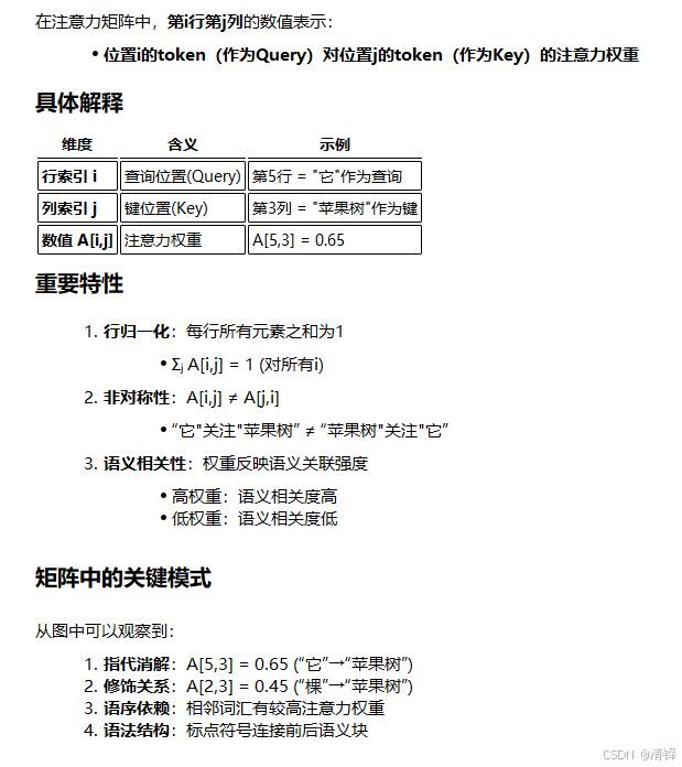 在注意力矩阵中,第i行第j列数值表示,位置i的token作为query对位置j的token(作为key)的注意力权重。高权重代表语义相关度高,反之。