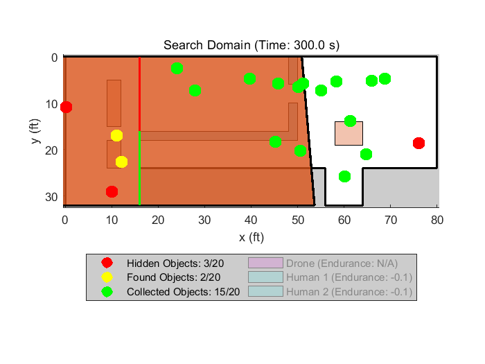 本次模拟旨在构建一个多智能体搜救模型,为真实搜救演练提供决策支持。演练采用消防场景,通过人类救援人员与无人机协同作业,从被大火吞噬的房间中营救目标。该模拟通过探索不同团队资源配置方案,分析何种策略能实现最大营救目标数量。模拟采用基于智能体的建模、路径规划及目标概率检测等多套建模工具。方法:搜救场景采用 MATLAB 的智能体建模技术进行模拟。每个搜救人员(1架无人机+2名人员)被建模为独立智能体,