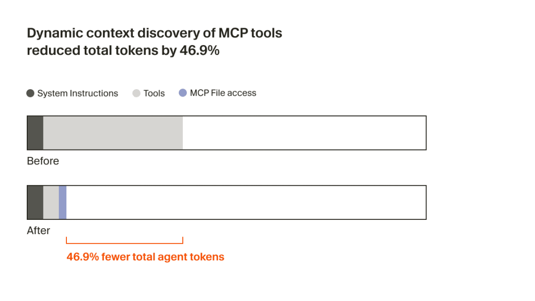 Agent 现在只会收到一小段静态上下文(包括工具名称),并在任务需要时再去查找具体工具。在一次 A/B 测试中,我们发现:在会调用 MCP 工具的运行中,这一策略 将 Agent 的总 token 消耗减少了 46.9%(这一结果在统计上显著,但会随已安装 MCP 的数量产生较大波动)。
