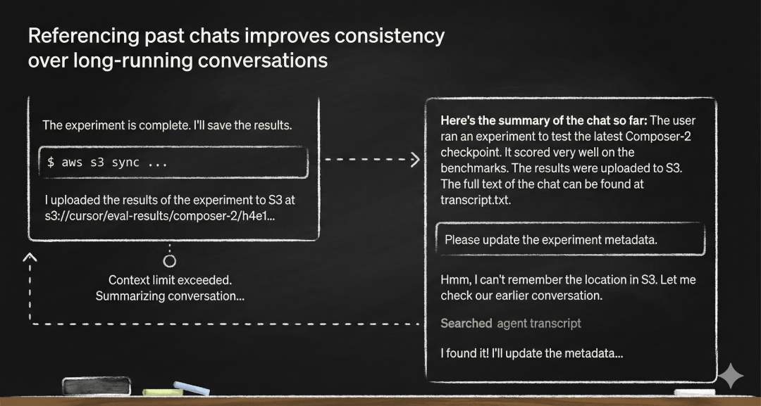 但由于这是对上下文的有损压缩,Agent 的掌握情况在摘要之后可能会变差,可能会忘记任务中的关键细节。在 Cursor 中,我们将对话历史作为文件提供,以提升摘要的质量。