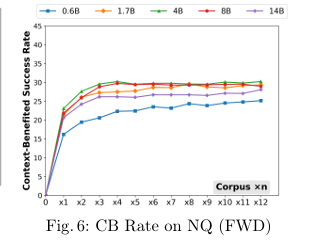 图6展示了不同模型尺寸下的上下文受益成功率(CB@n)。所有模型都呈现出相似的趋势:从没有检索()到使用第一个分片()时,性能出现巨大飞跃;之后随着分片增加,性能继续增长,但增速放缓,大约在 之后趋于饱和。这表明,RAG的核心价值在于提供了外部知识,哪怕只是一个小的知识库,也能解决大量模型自身的知识盲点。