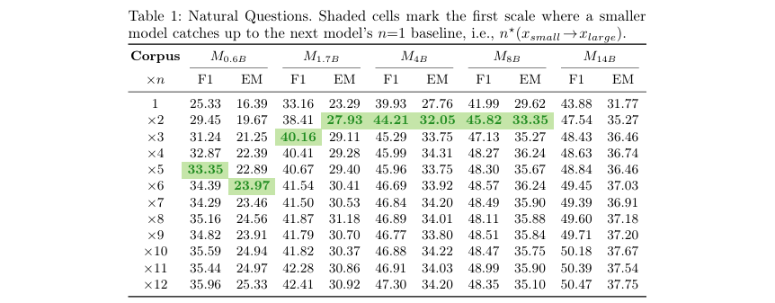 实验结果清晰地表明,扩大语料库确实能让小模型赶上甚至超越大模型。以NQ数据集为例(见表1),一个4B参数的模型,在语料库规模扩大到2倍()时,其F1分数(44.21)就超过了8B模型在基础语料库()下的表现(41.99)。这意味着追赶阈值。同样地,。这说明在中大型模型之间,只需将文档库加倍,就能弥补模型尺寸上的差距。