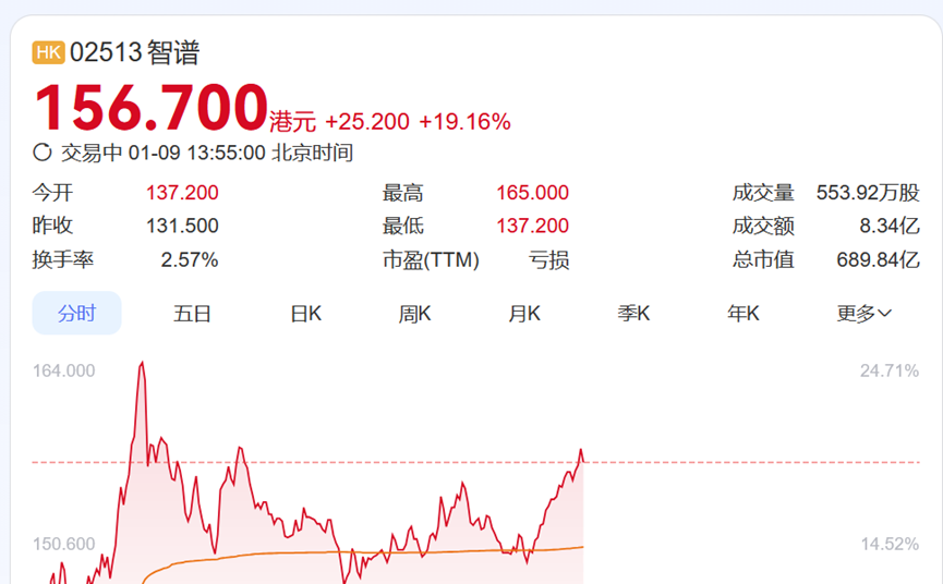 今天持续走高,已暴涨至156.7港元/股,总市值高达689亿元,创造了中国AI领域的新纪录。