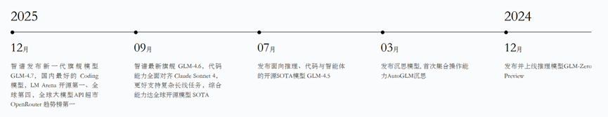 2025年下半年,智谱AI连续发布了GLM-4.5、GLM-4.6和GLM-4.7三代模型,技术性能不断攀升。GLM-4.5被定位为首款原生Agent基座模型,在12个评测基准中取得全球第三、国产第一的成绩。