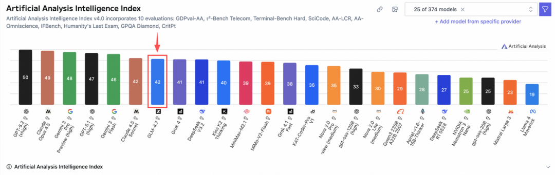 12月,在模型综合能力榜单Artificial Analysis中,GLM-4.7获得开源模型与国产模型双料榜首。