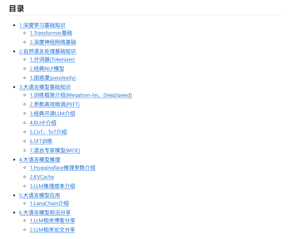 这部分的内容包括大模型训练框架,比如Megatron-LM, DeepSpeed, 高效参数微调的方法,当前主流的开源大模型,RLHF流程的介绍,COT和TOT的介绍,监督微调的训练,最后是混合专家模型MOE