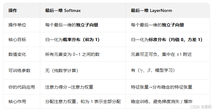 | LayerNorm 后 | [[[-1,1], [-1,1], [-1,1]]] | 每个子向量均值 0、方差 1,维度不变 |