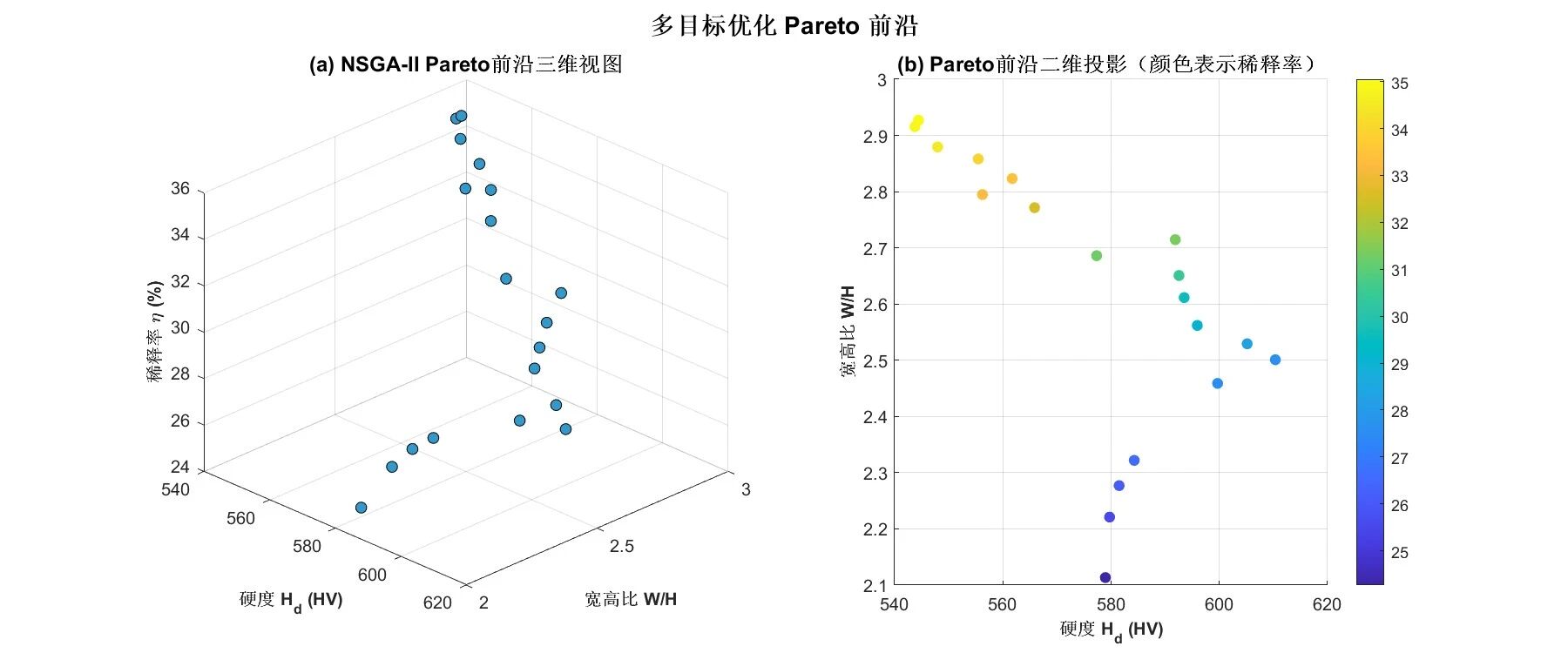 传统单因素优化方法无法兼顾多参数耦合影响,也难以平衡 “硬度提升”“孔隙率降低”“开裂风险最小化” 等多个目标。而响应面法(RSM)的 “交互分析能力” 与 NSGA-II 算法的 “多目标寻优优势”,恰好形成互补,成为破解这一难题的核心组合拳。